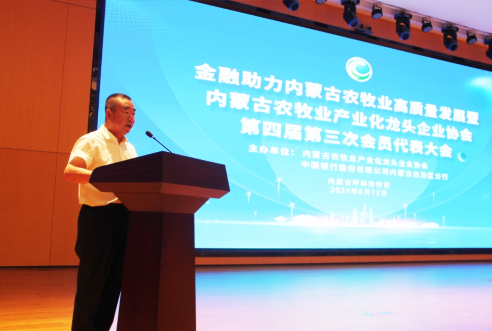 2024612日,自治區(qū)工商聯(lián)、農(nóng)牧廳、財政廳、黨委金融辦、工信廳、市場監(jiān)督管理局、能源局、國家金融監(jiān)督管理總局內(nèi)蒙古監(jiān)管局、中國人民銀行內(nèi)蒙古自治區(qū)分行、人民網(wǎng)主辦,內(nèi)蒙古農(nóng)牧業(yè)產(chǎn)業(yè)化龍頭企業(yè)協(xié)會承辦的政策落地進商會直達快享惠民企及金融助力內(nèi)蒙古農(nóng)牧業(yè)高質量發(fā)展暨內(nèi)蒙古農(nóng)牧業(yè)產(chǎn)業(yè)化龍頭企業(yè)協(xié)會第四屆三次會員代表大會在呼和浩特市成功舉辦。內(nèi)蒙古自治區(qū)政協(xié)副主席、工商聯(lián)主席安潤生,內(nèi)蒙古自治區(qū)農(nóng)牧廳二級巡視員吳忠?guī)r,中國銀行內(nèi)蒙古自治區(qū)分行黨委書記、行長胡昆,自治區(qū)工商聯(lián)黨組成員、副主席白春艷、自治區(qū)農(nóng)牧廳鄉(xiāng)村產(chǎn)業(yè)發(fā)展和農(nóng)墾處處長黃偉,自治區(qū)農(nóng)牧廳市場與對外合作處處長侯雁冰,自治區(qū)農(nóng)牧廳農(nóng)畜產(chǎn)品加工指導處處長徐大偉,內(nèi)蒙古自治區(qū)農(nóng)牧廳農(nóng)畜產(chǎn)品產(chǎn)銷服務中心主任鄔冰泉,內(nèi)蒙古自治區(qū)農(nóng)牧廳種植業(yè)管理處三級調(diào)研員文占平,自治區(qū)農(nóng)牧業(yè)技術推廣中心鄉(xiāng)村產(chǎn)業(yè)處處長趙于東、產(chǎn)業(yè)化分析師董文琪,內(nèi)蒙古自治區(qū)農(nóng)畜產(chǎn)品質量安全監(jiān)督管理中心科長郝貴賓,自治區(qū)工商聯(lián)副主席、協(xié)會會長周勇等各主辦廳局領導出席會議。