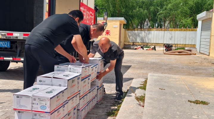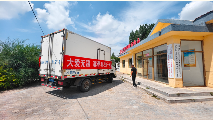 捐贈(zèng)現(xiàn)場(chǎng),一輛懸掛“大愛無疆 澳菲利在行動(dòng)”紅色條幅的冷鏈車緩緩駛?cè)胩缀f?zhèn)永生村村委會(huì),車剛停穩(wěn),工作人員迅速將一箱箱羊肉產(chǎn)品搬下車,整齊碼放在村委會(huì)門口,現(xiàn)場(chǎng)暖意涌動(dòng)。