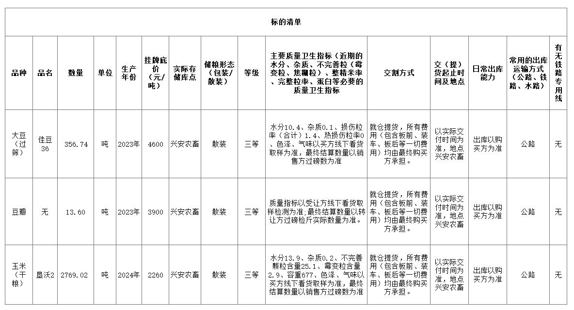 轉讓標的為大豆(佳豆36)356.74噸、玉米(墾沃2)2769.02 噸、豆瓣13.6噸,標的存放地位于呼倫貝爾市鄂倫春自治旗,詳情見標的清單(含主要質量指標、存儲等信息):
