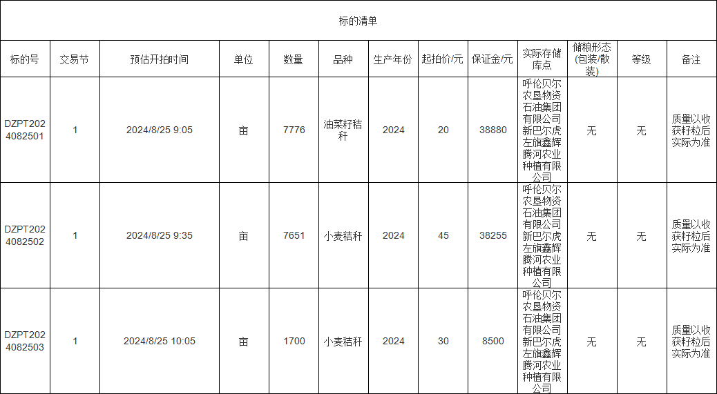 轉(zhuǎn)讓標(biāo)的為油菜籽秸稈、小麥秸稈、小麥秸稈,涉及面積油菜籽秸稈7776畝、小麥秸稈7651畝、小麥秸稈1700畝,意向受讓方在競買前應(yīng)自行對標(biāo)的預(yù)估數(shù)量和質(zhì)量情況進(jìn)行充分了解,交易標(biāo)的均以實際狀況為準(zhǔn)。標(biāo)的存放地位于呼倫貝爾農(nóng)墾物資石油集團(tuán)有限公司新巴爾虎左旗鑫輝騰河農(nóng)業(yè)種植有限公司,詳情見標(biāo)的清單: