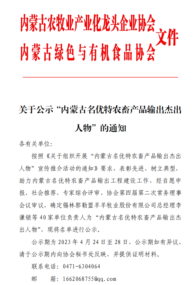 關(guān)于公示“內(nèi)蒙古名優(yōu)特農(nóng)畜產(chǎn)品輸出杰出人物”的通知