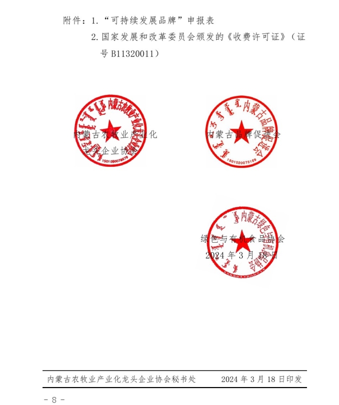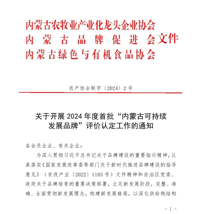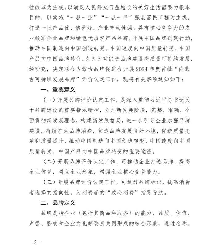 關(guān)于開展2024年度首批“內(nèi)蒙古可持續(xù) 發(fā)展品牌”評價認定工作的通知