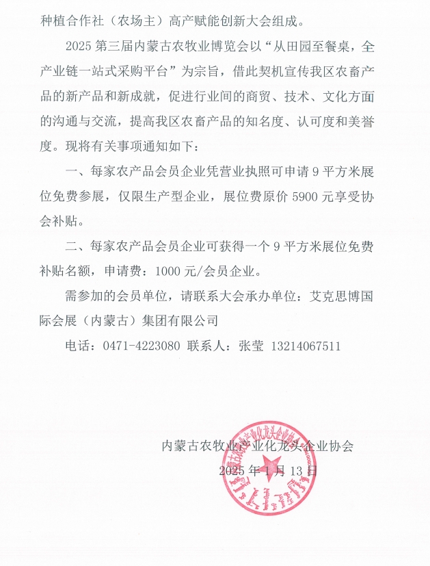 關(guān)于會(huì)員單位免費(fèi)參加“2025第三屆內(nèi)蒙古農(nóng)牧業(yè)博覽會(huì)”的通知
